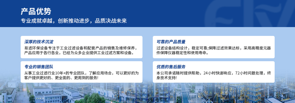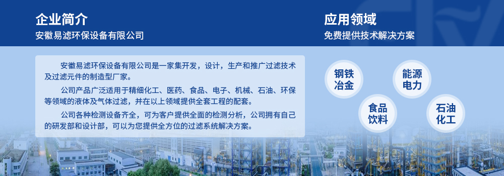 安徽易滤环保设备公司是一家集开发,设计,生产和推广过滤技术及过滤元件的制造型厂家。公司产品广泛适用于精细化工、医药、食品、电子、机械、石油、环保等领域的液体及气体过滤,并在以上领域提供全套工程的配套。 公司各种检测设备齐全,可为客户提供全面的检测分析,公司拥有自己的研发部和设计部,可以为您提供全方位的过滤系统解决方案。